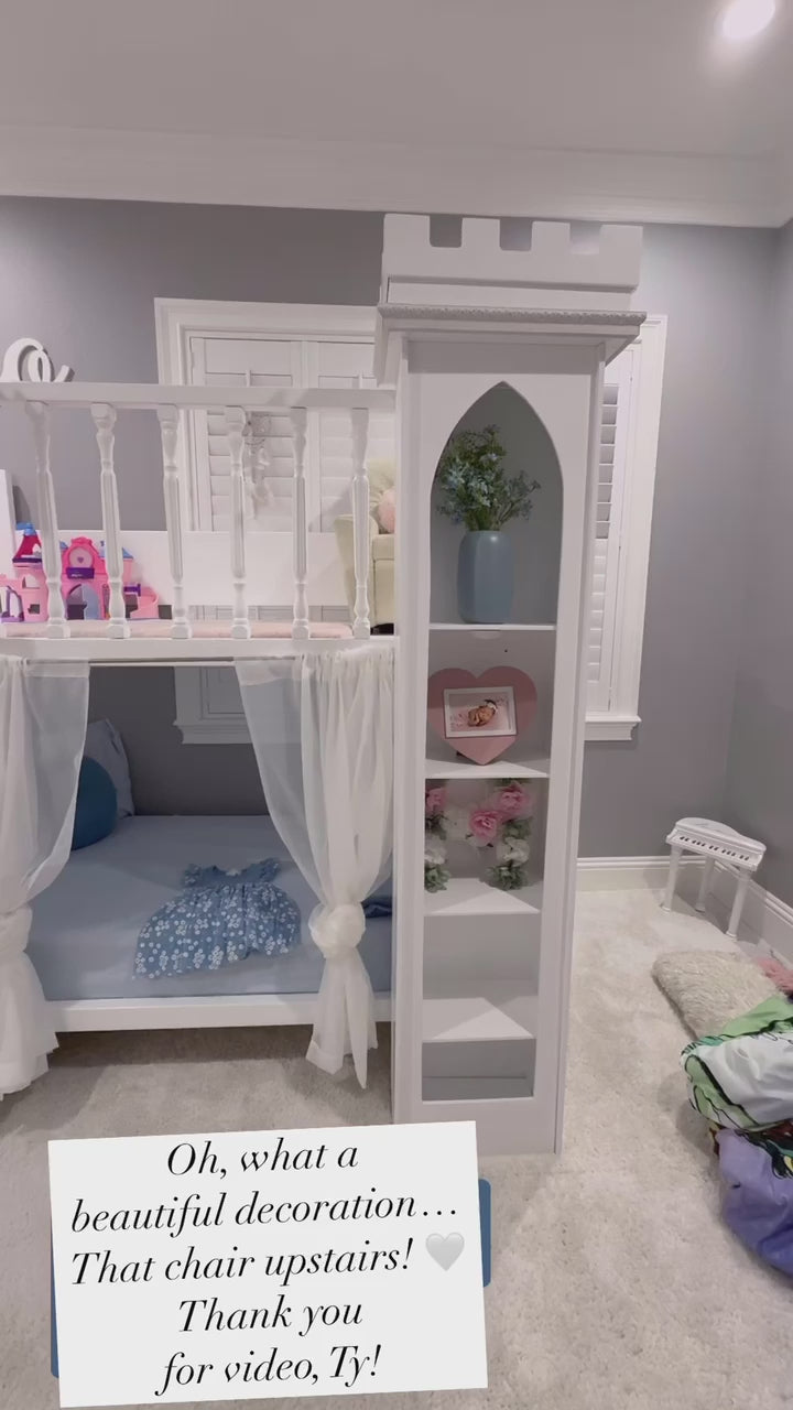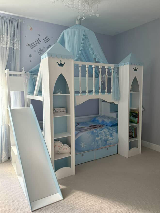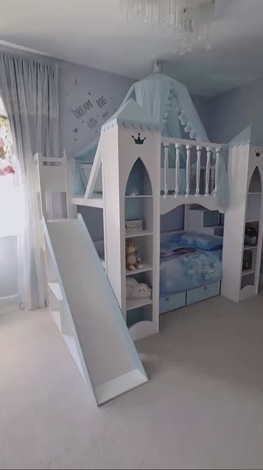 The Princess Castle bed can be used as a bunk bed with two mattresses or as a single bed with a play area. Each color combination is custom for every order—we will send you a catalog to choose from, or you can send us a note with your desired combination (any color system code is okay!).