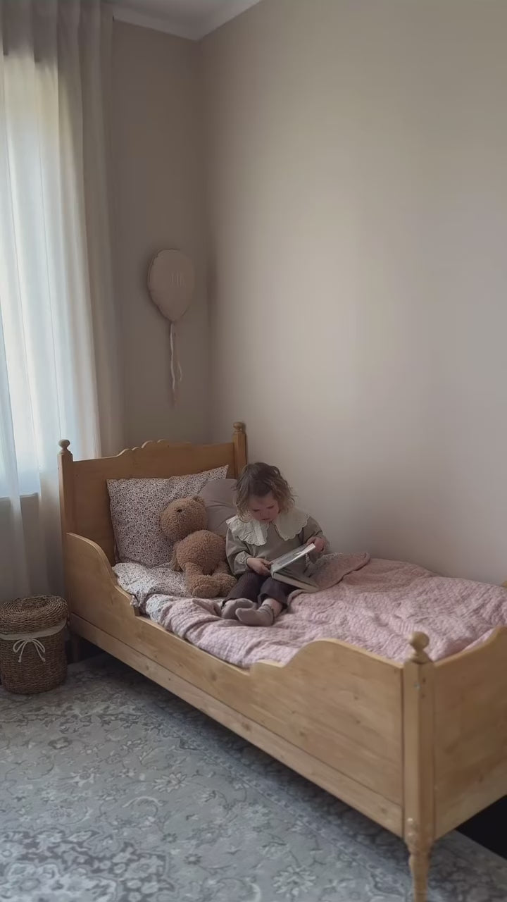 Our beautifully crafted toddler sleigh bed is the perfect addition to a vintage-inspired children's room. Made from solid pine wood, this bed is not only durable but also features water-based, child-safe finishes. With its customizable design, you can choose from various sizes and wood stains or even painted solid color to match your interior. Free shipping to US and EU, included in price. Made in Europe.